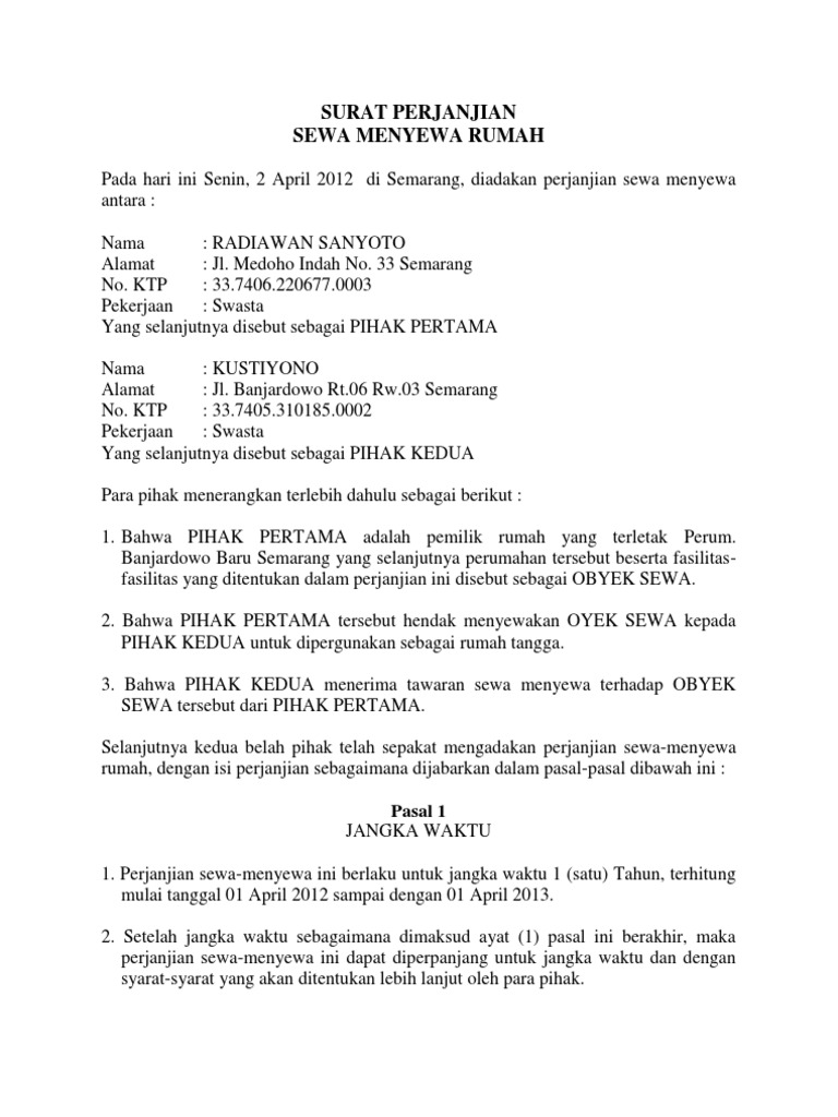 Contoh perjanjian sewa menyewa , baik itu perjanjian sewa rumah, sewa mobil, sewa alat berat maupun perjanjian sewa menyewa barang lain. Dengan adanya kesepakatan tersebut, maka timbullah sebuah perjanjian yang harus dipatuhi oleh kedua belah pihak. Acuan pembuatan surat perjanjian sewa rumah ini memiliki poin penting yang harus tercantum dalam surat tersebut. Tetapi, dalam beberapa kasus, ada juga surat perjanjian sewa yang menyangkut barang lain. Surat perjanjian sewa rumah harus dibuat dengan menggunakan materai agar kedua belah pihak bisa melakukan perannya dengan baik dan tidak saling perjanjian sewa tahunan memiliki jangka waktu yang cukup panjang, untuk itu surat yang dibuat harus detail dan bisa berlaku untuk waktu yang lama. Kandungan surat perjanjian adalah berbeza mengikut rumah sewa tersebut, namun begitu. Contoh surat perjanjian sewa menyewa rumah 1 tahun, 3 tahun, 10 tahun. Surat perjanjian sewa rumah uploaded by wan. Semoga dapat memberikan manfaat yang berharga bagi anda dan. Padahal jika suatu hari terjadi satu kasus, surat ini akan sangat membantu memecahkan permasalahannya. Surat perjanjian sewa rumah adalah dokumen yang mengatur kesepakatan sewa rumah antara penyewa dan pemilik rumah. Mayoritas orang melakukan transaksi tersebut di bawah tangan atau tanpa pernyataan tertulis secara legal. Namun, penggunaan surat perjanjian sewa rumah dalam transaksi tersebut acap kali dilupakan.
